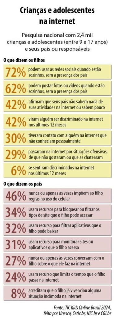 A pesquisa TIC Kids Online Brasil 2024, que ouviu crianças e adolescentes (entre 9 e 17 anos de idade) e seus pais, revela que, enquanto 29% dos jovens relataram já ter vivido situações incômodas ou ofensivas no mundo digital, apenas 8% dos pais afirmaram acreditar que os filhos já experimentaram situações desse tipo.